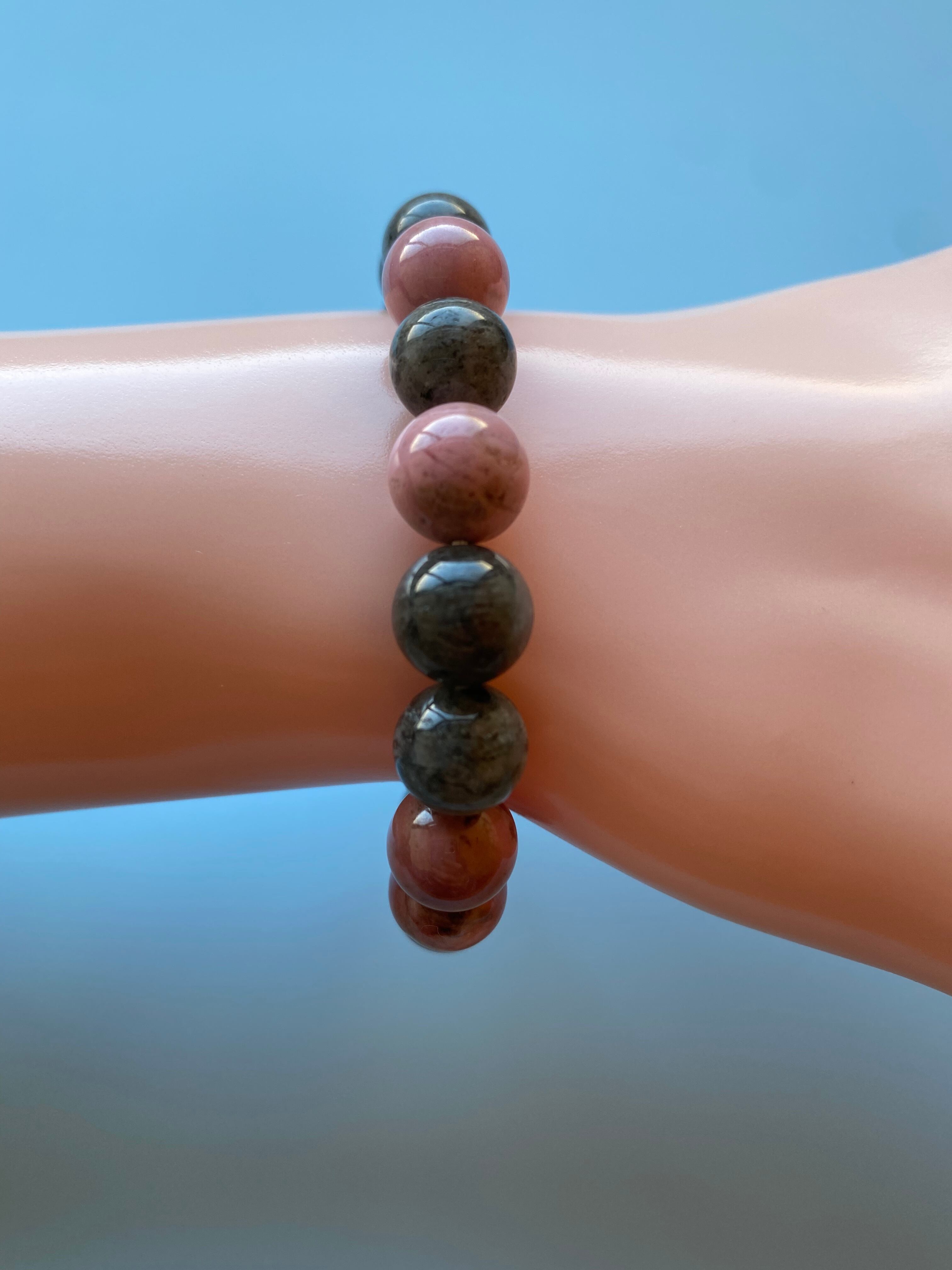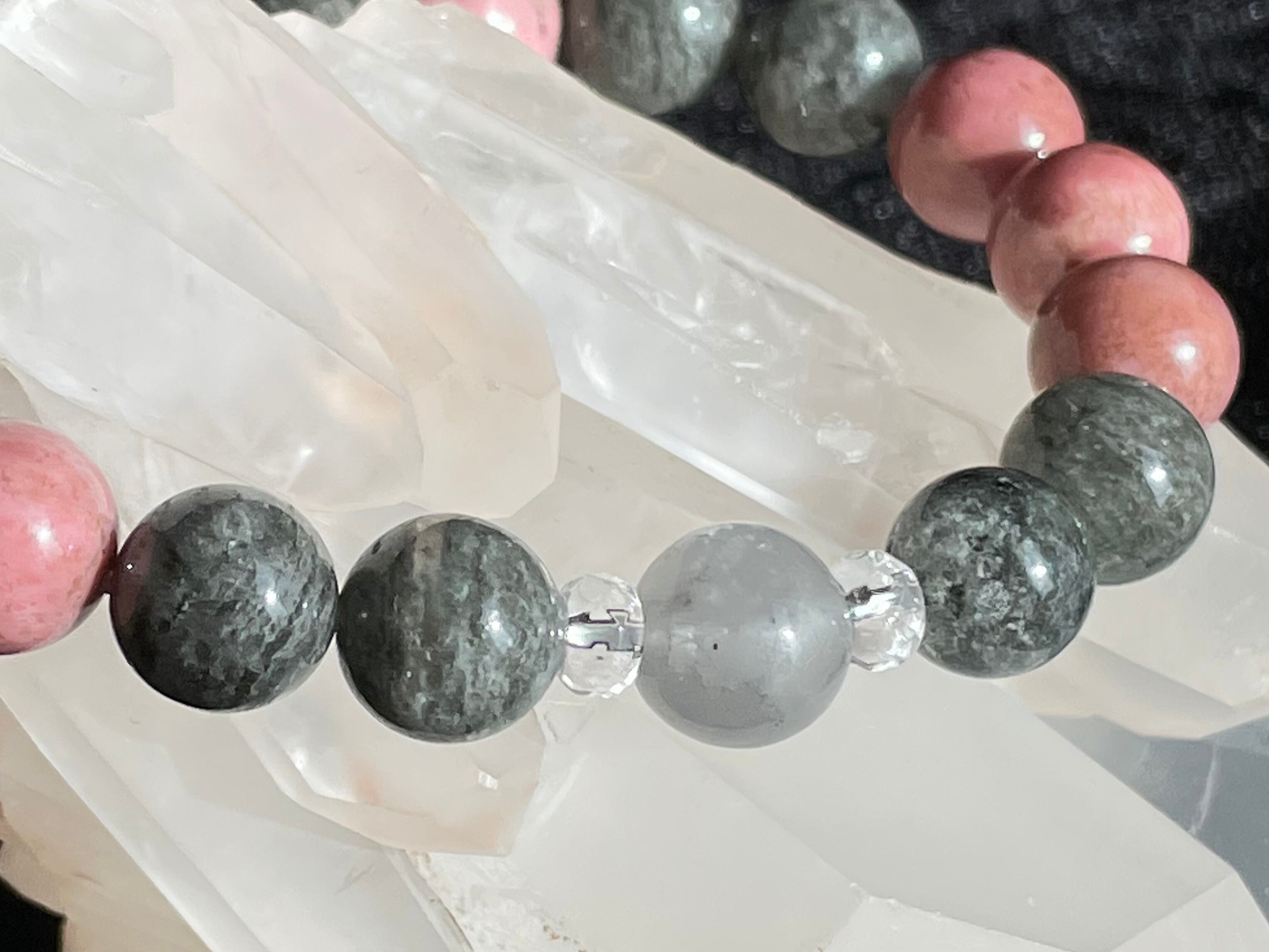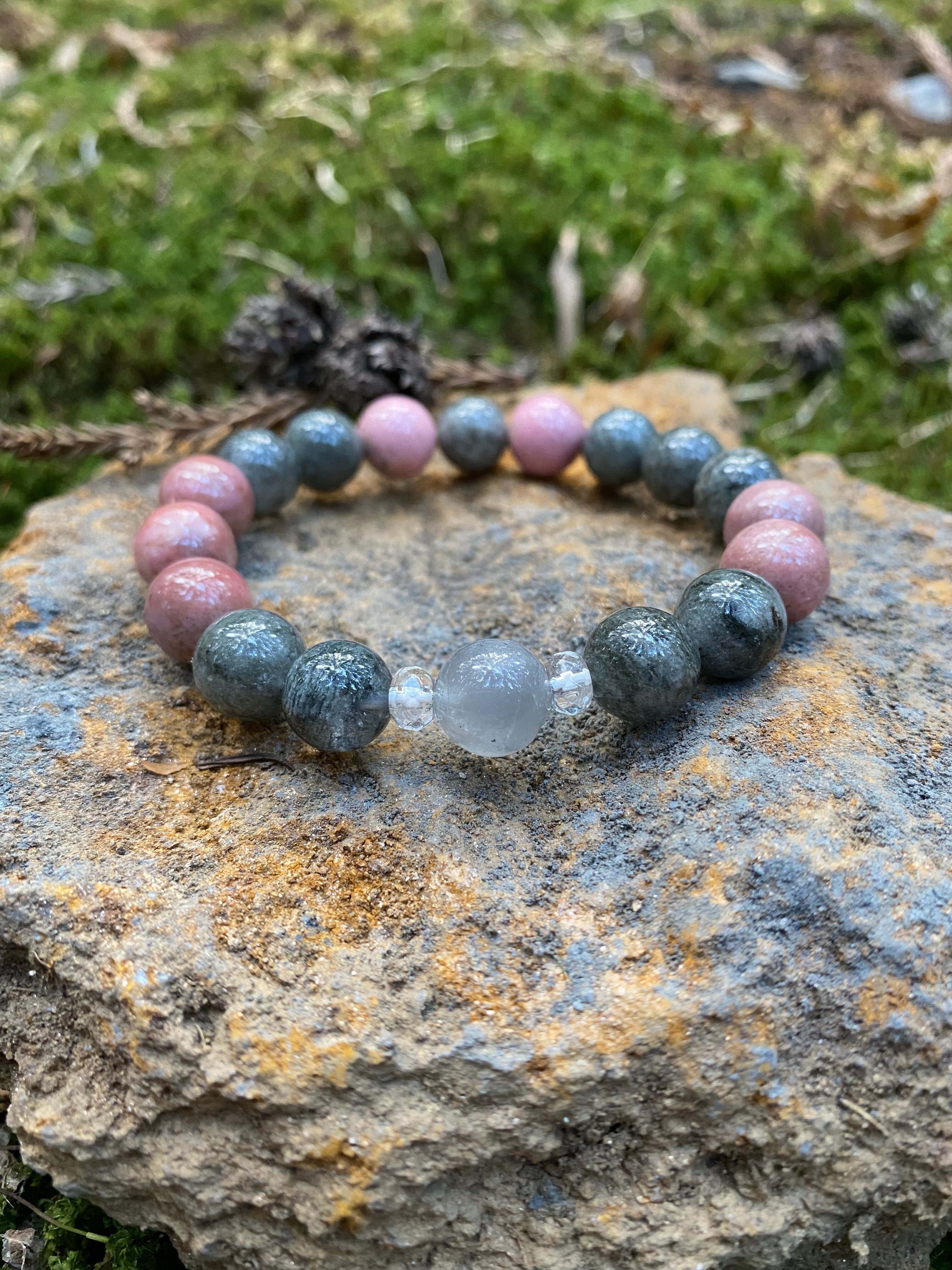 ロードナイトの中でも、くすみカラーのものを選び、グレイッシュモスグリーンのガーデンクォーツと組み合わせた、大人かわいいブレスです。