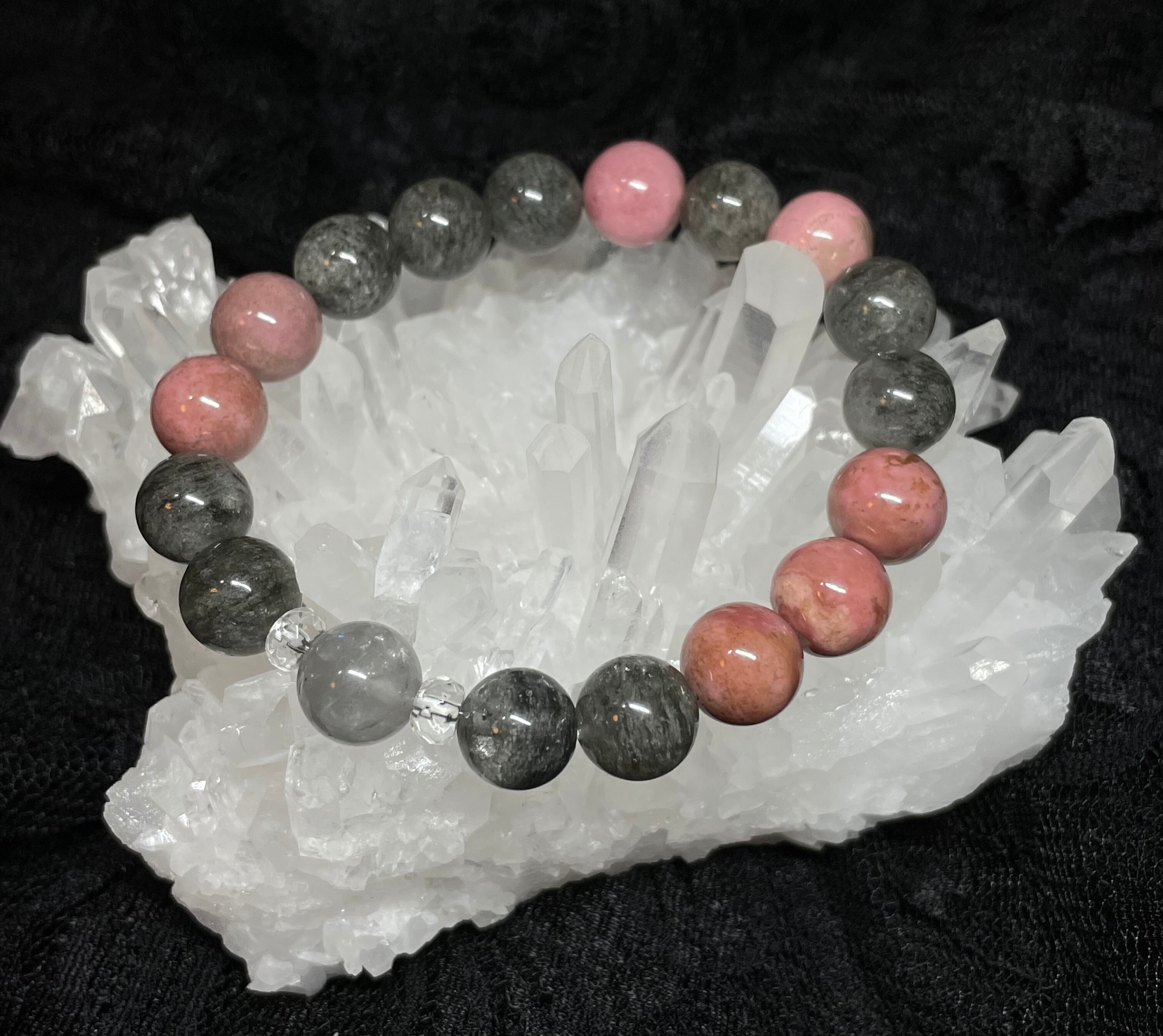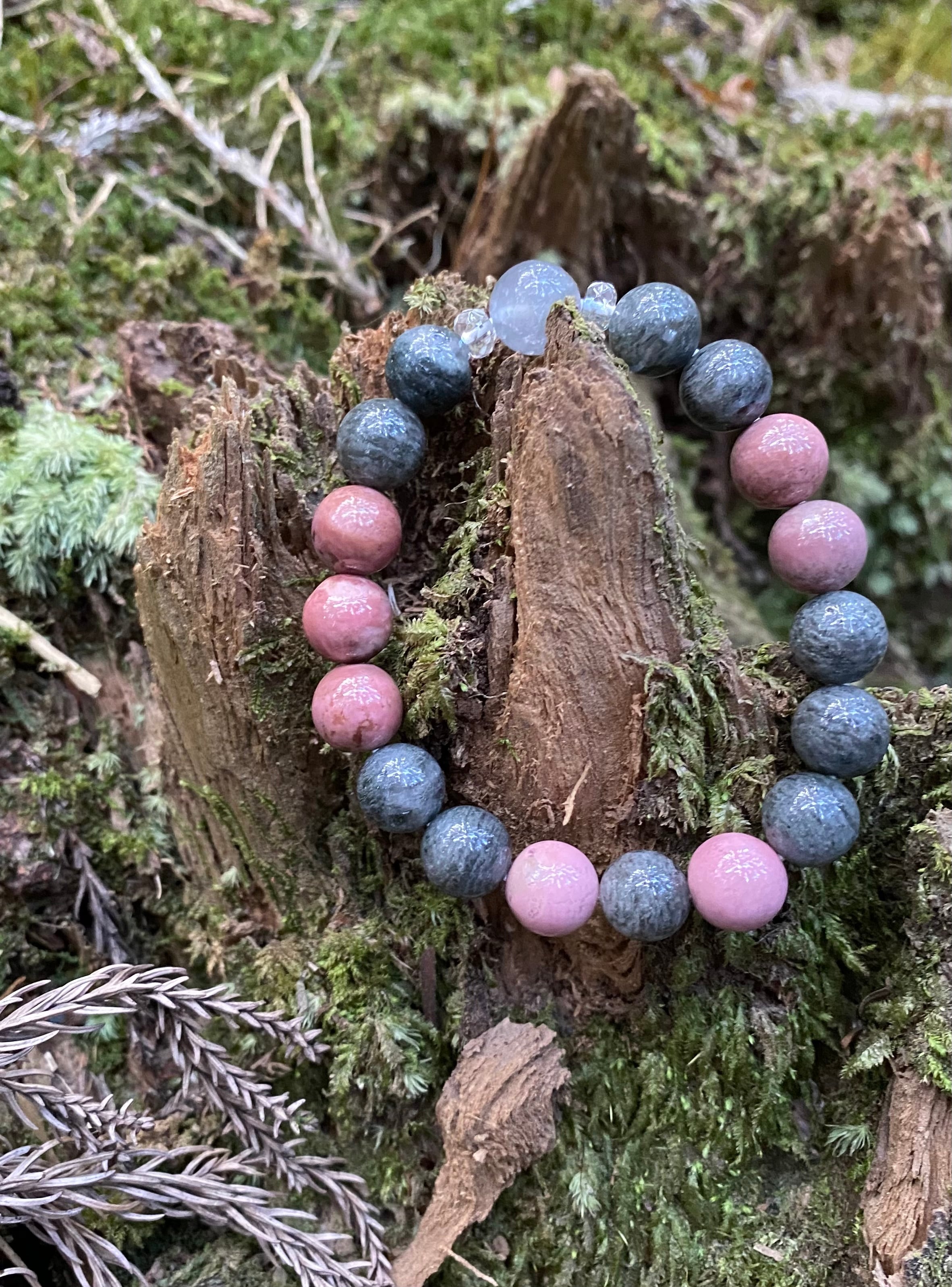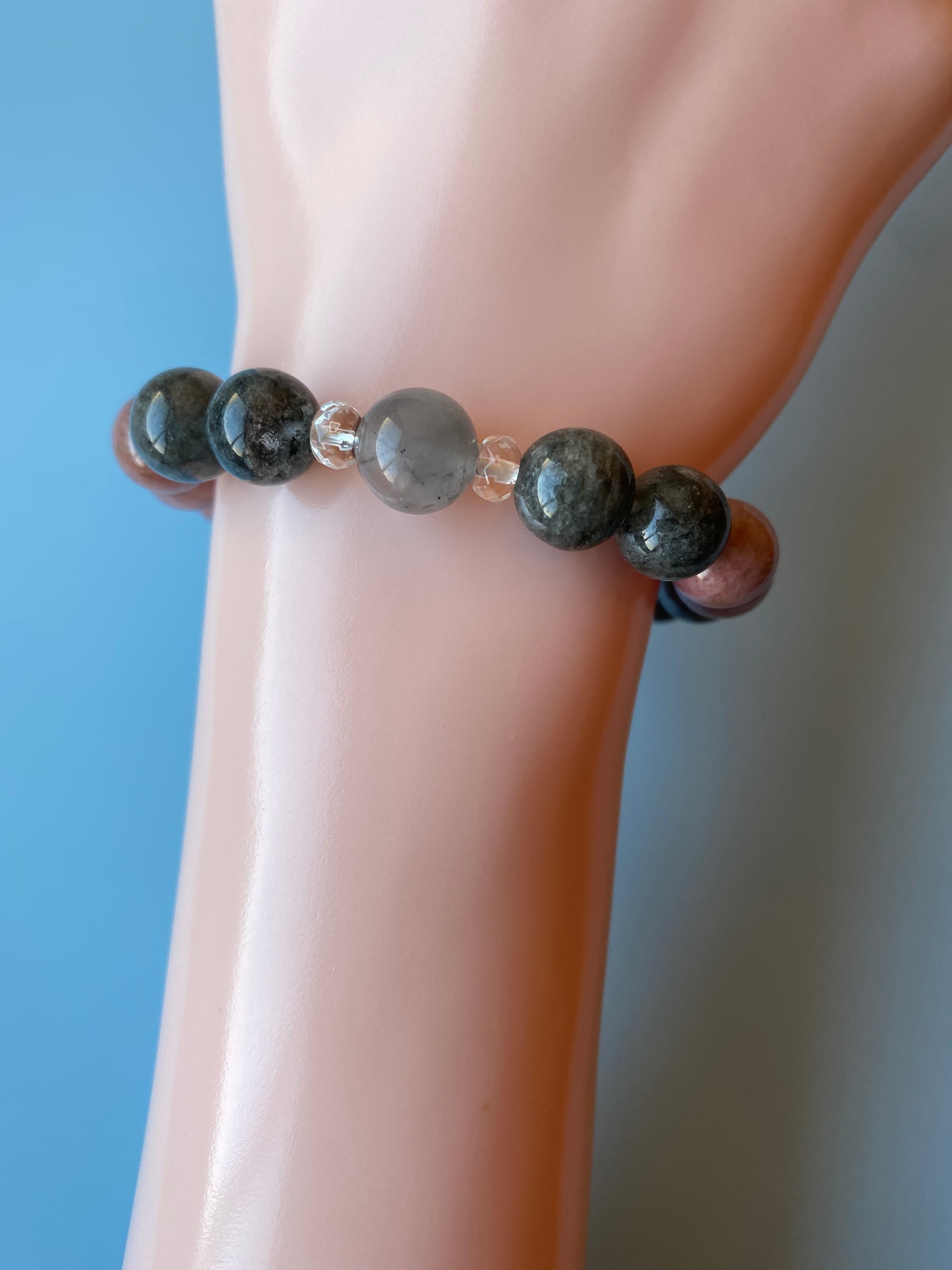 ロードナイトの中でも、くすみカラーのものを選び、グレイッシュモスグリーンのガーデンクォーツと組み合わせた、大人かわいいブレスです。