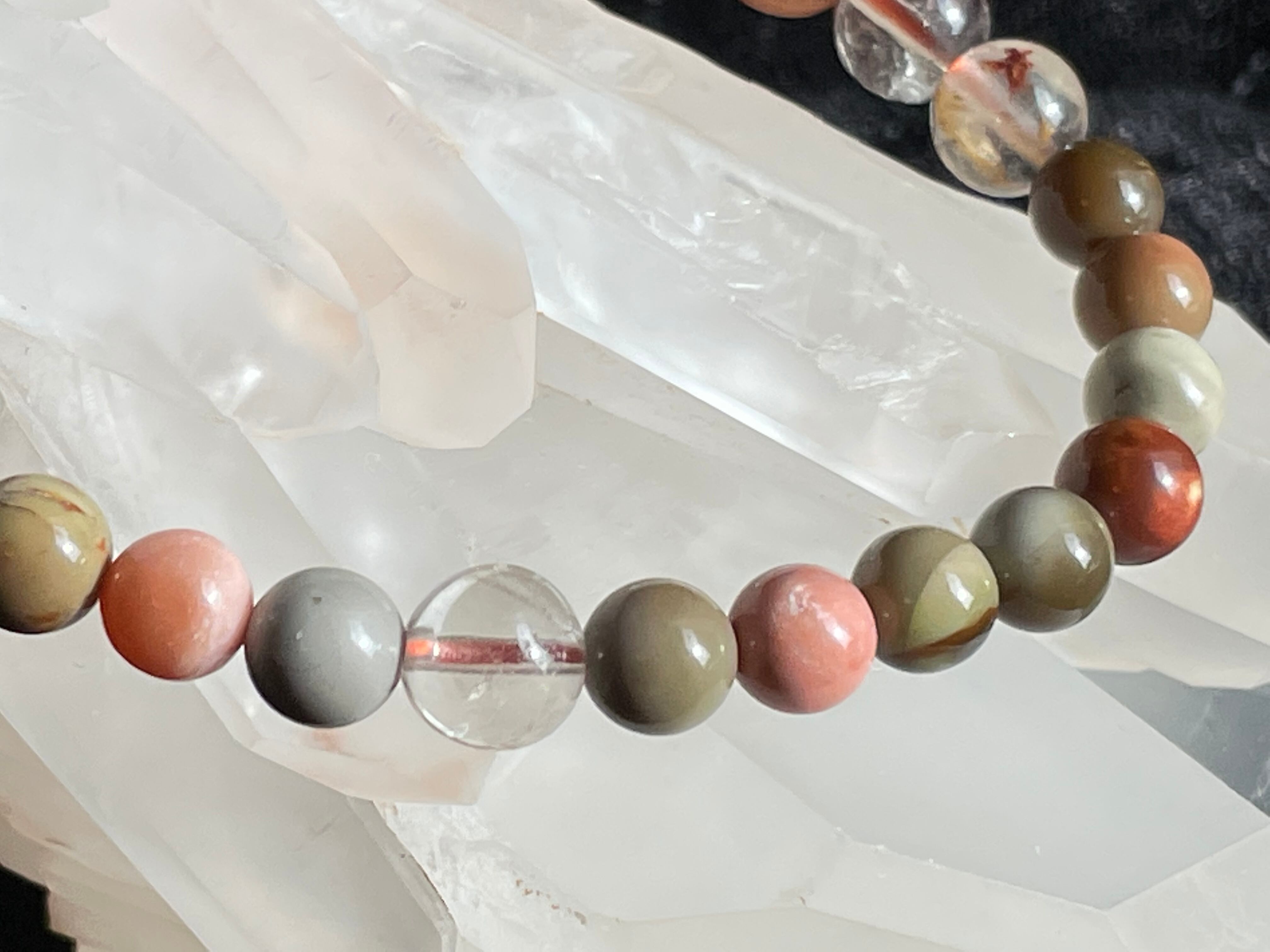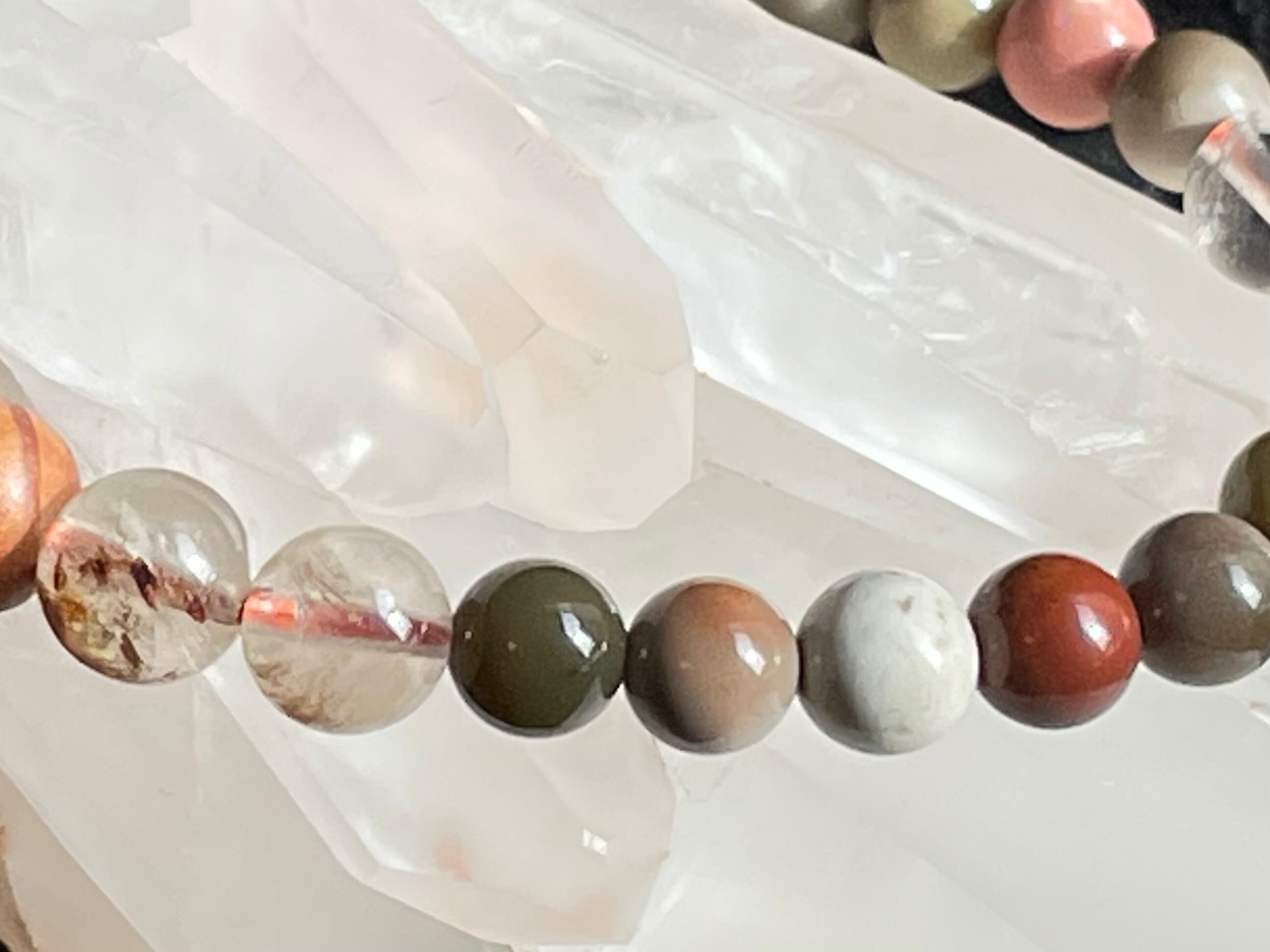 ・石の種類と玉の直径:血龍木(ラジュカユ)(8mm)、ガーデンクォーツ(7.5mm)、アラシャンゴビアゲート(6mm)