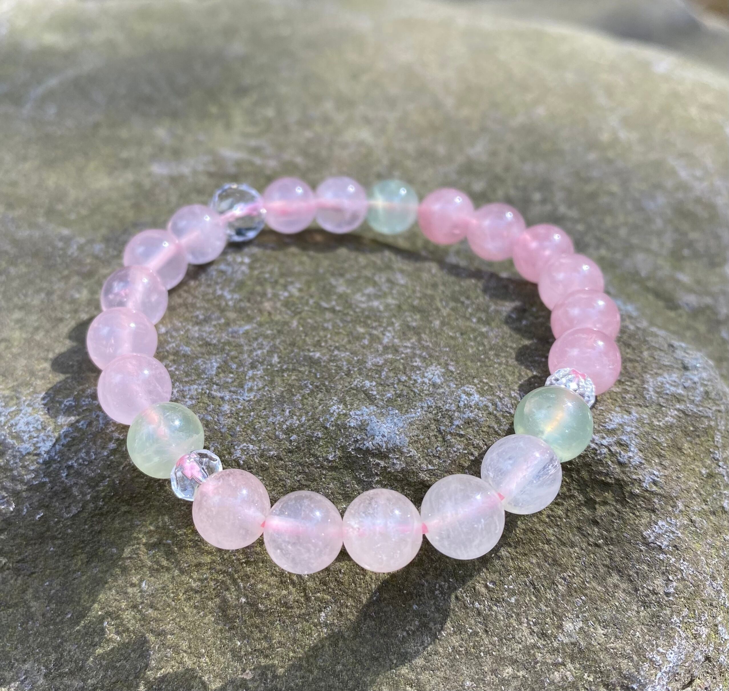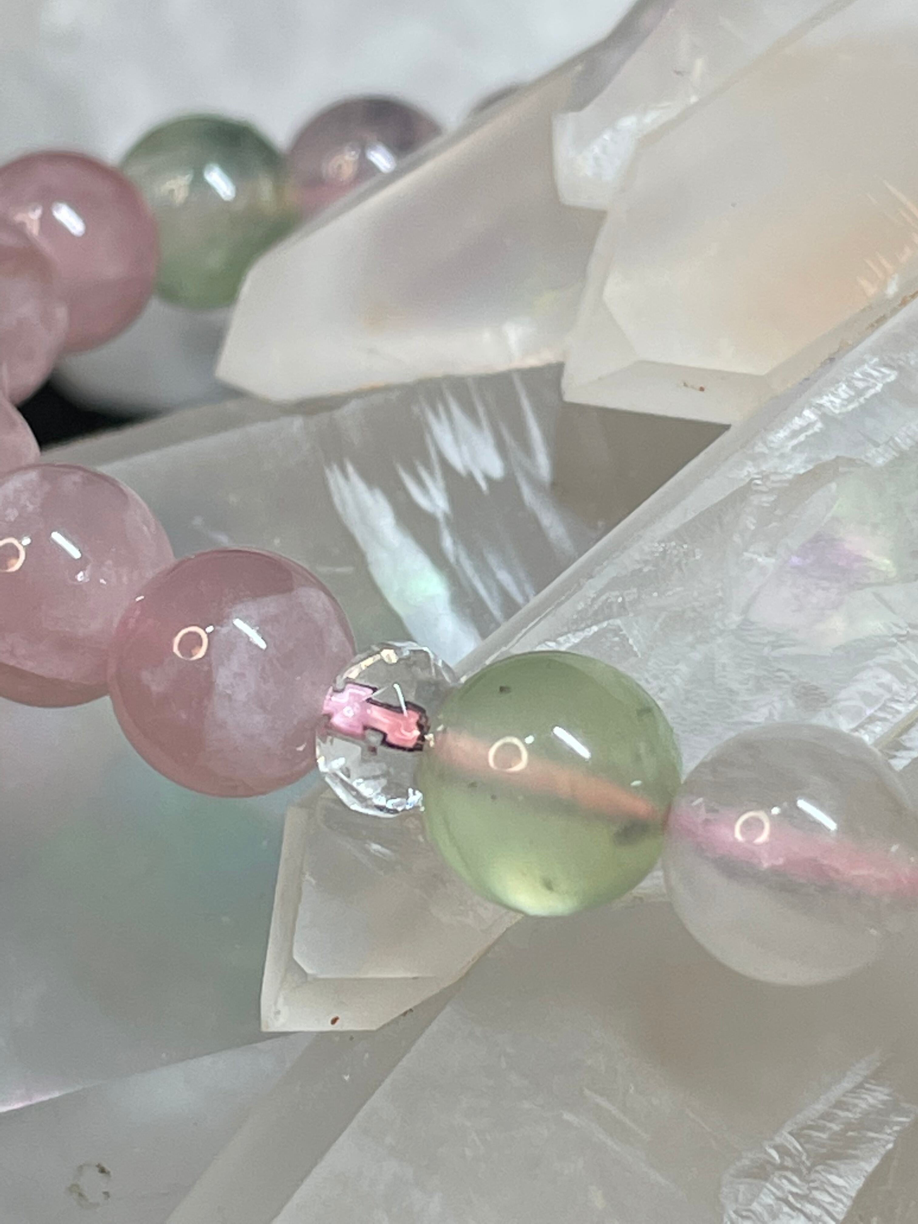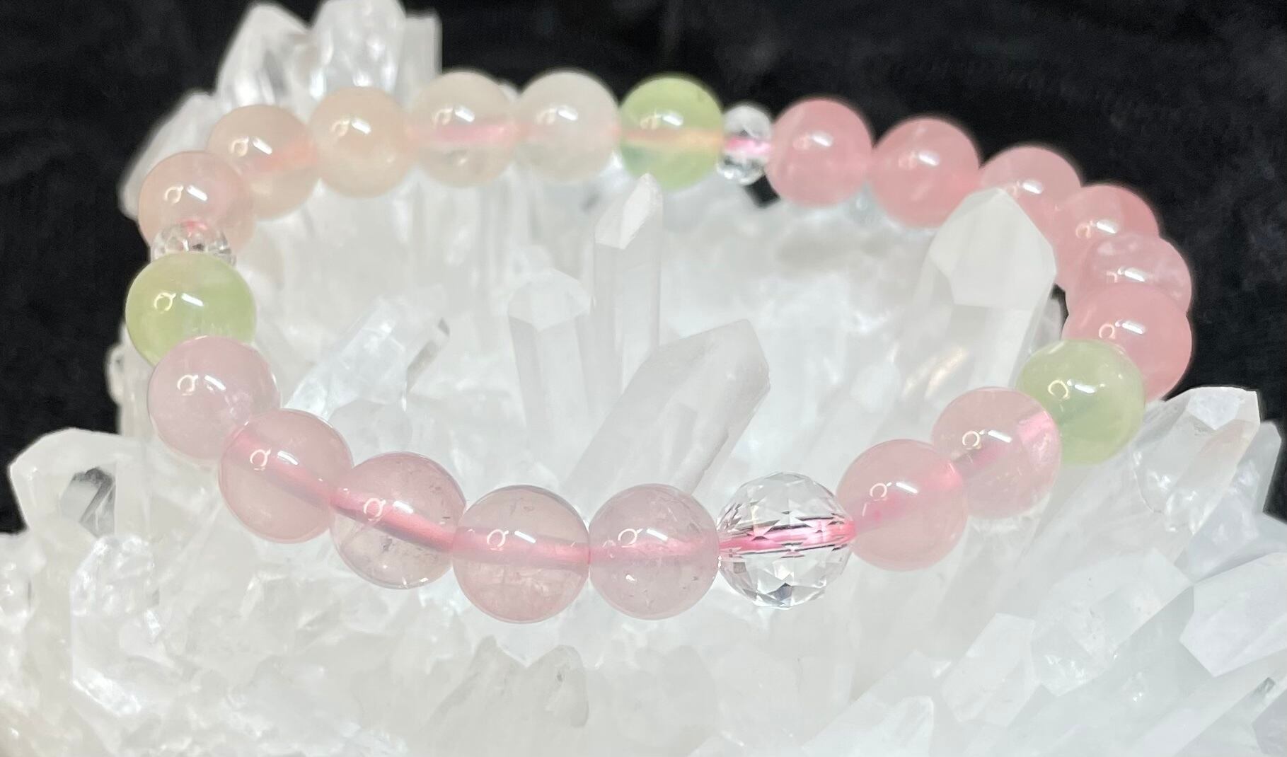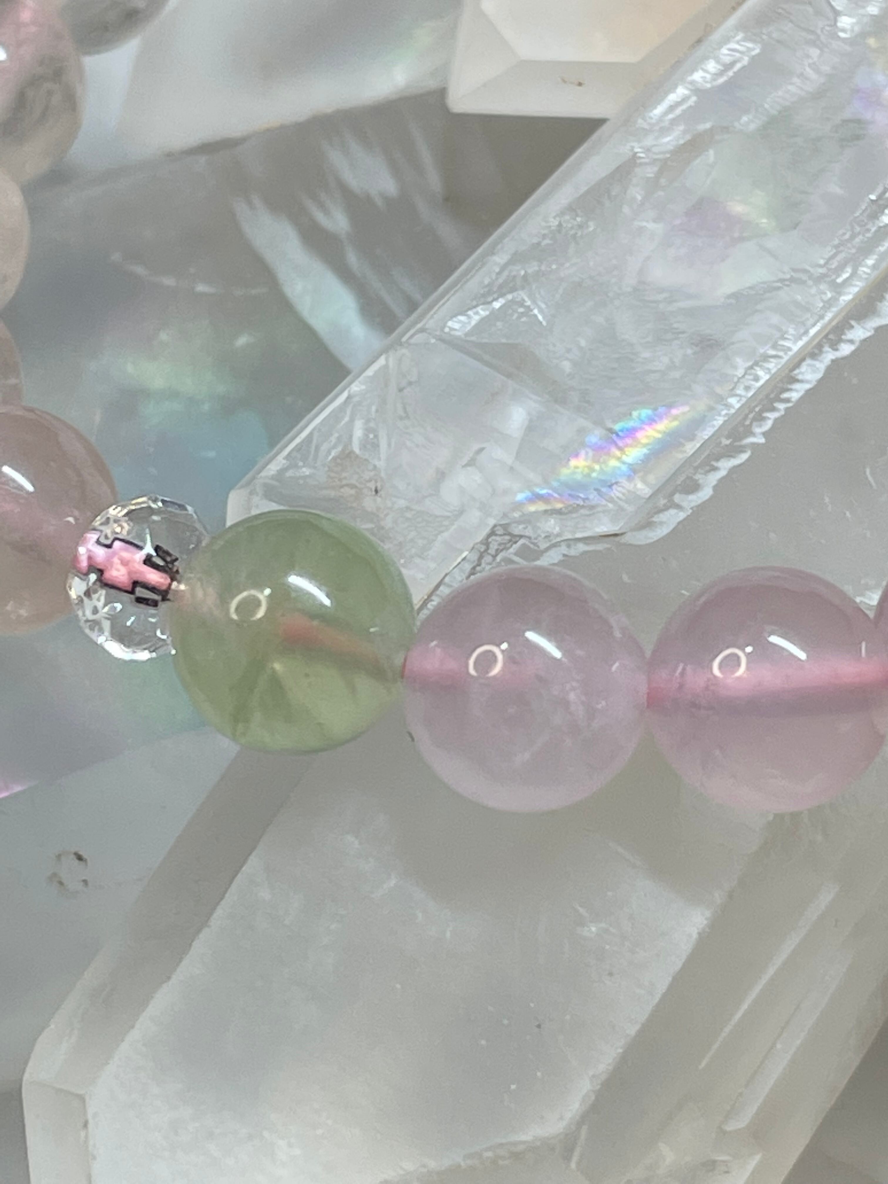 ・石の種類と玉の直径:ローズクォーツ(8mm)、ディープローズクォーツ(8mm)、モルガナイト(8mm)、プレナイト(8mm)、水晶ダイヤモンドカット、水晶ボタン