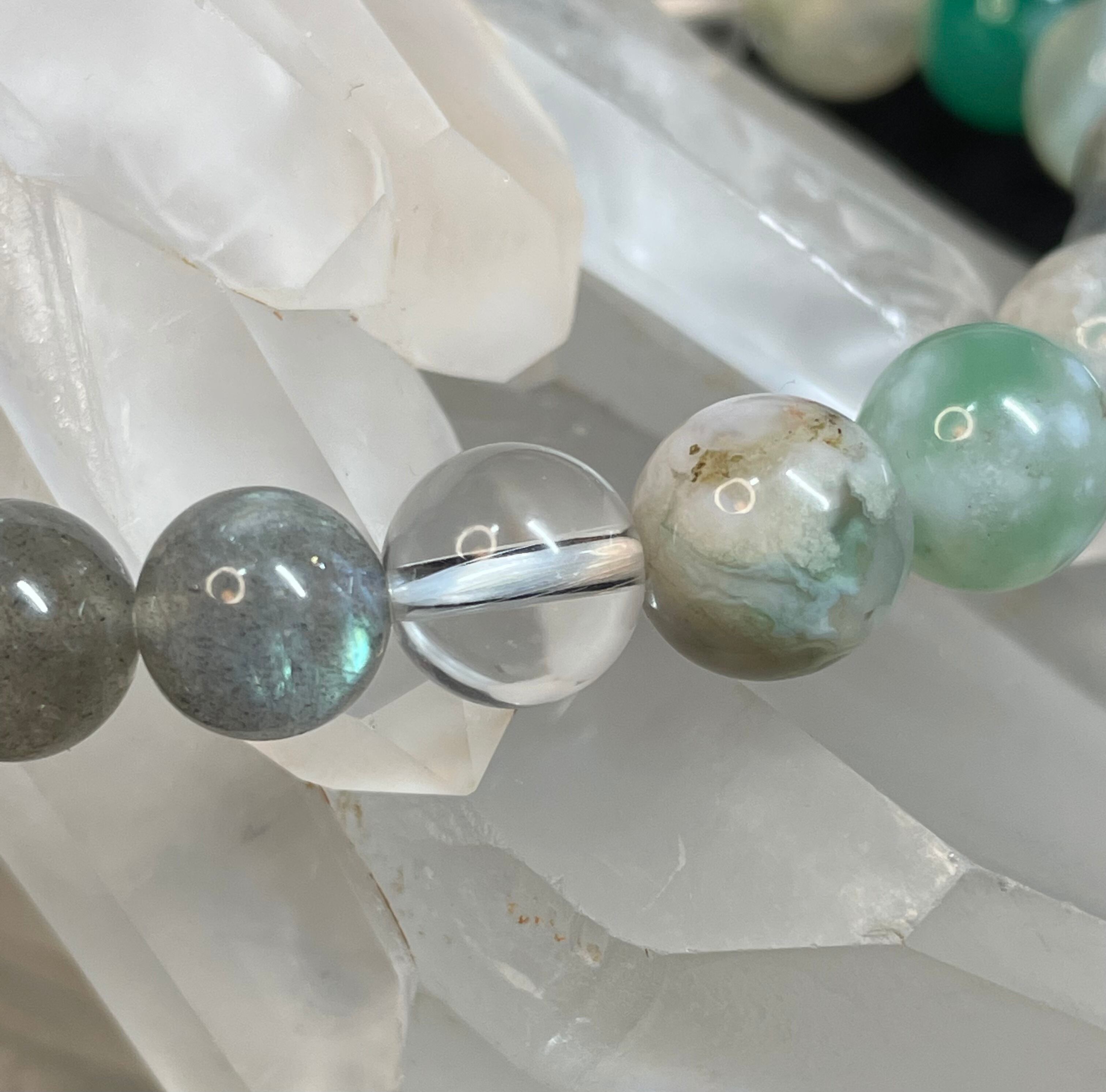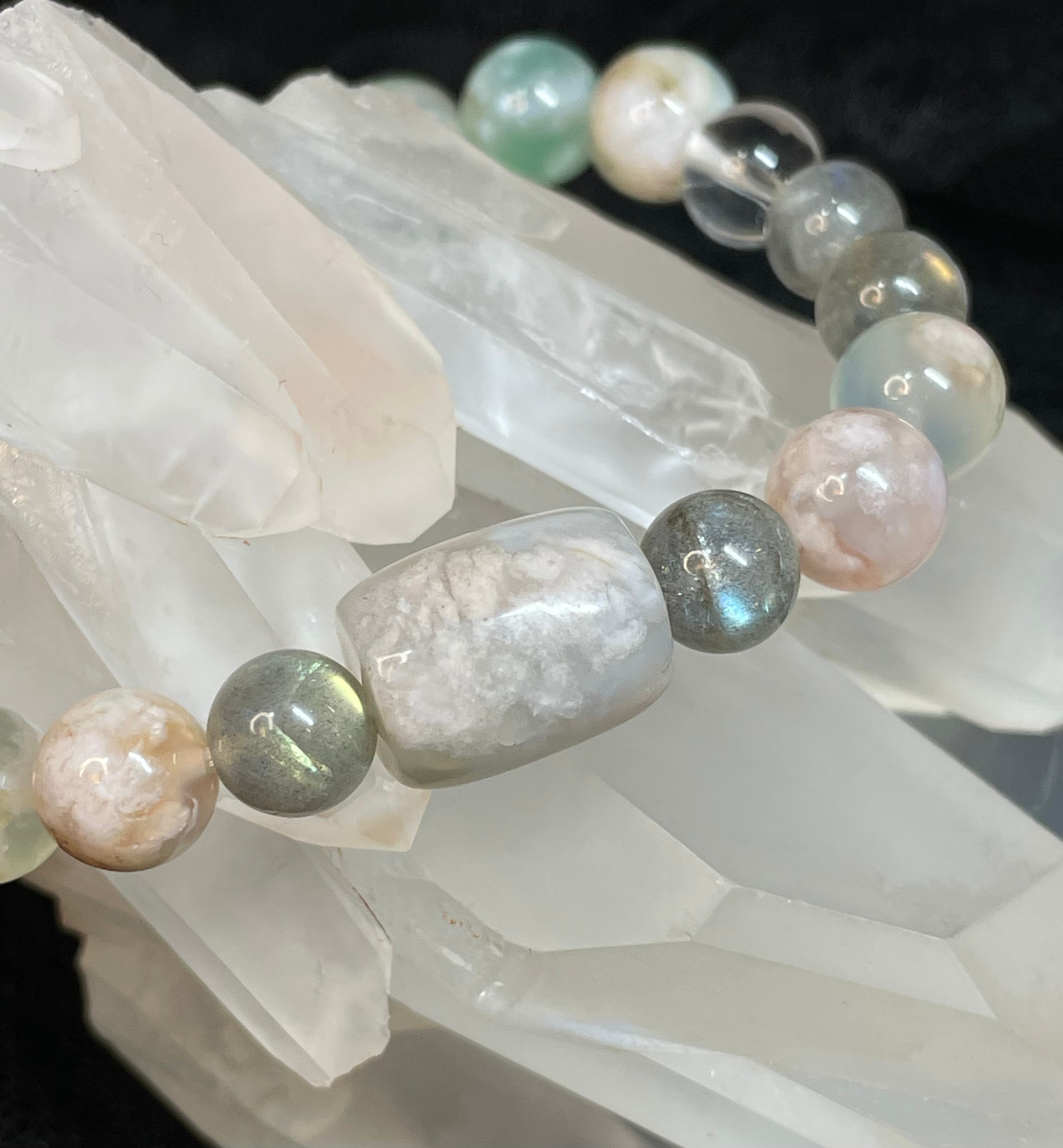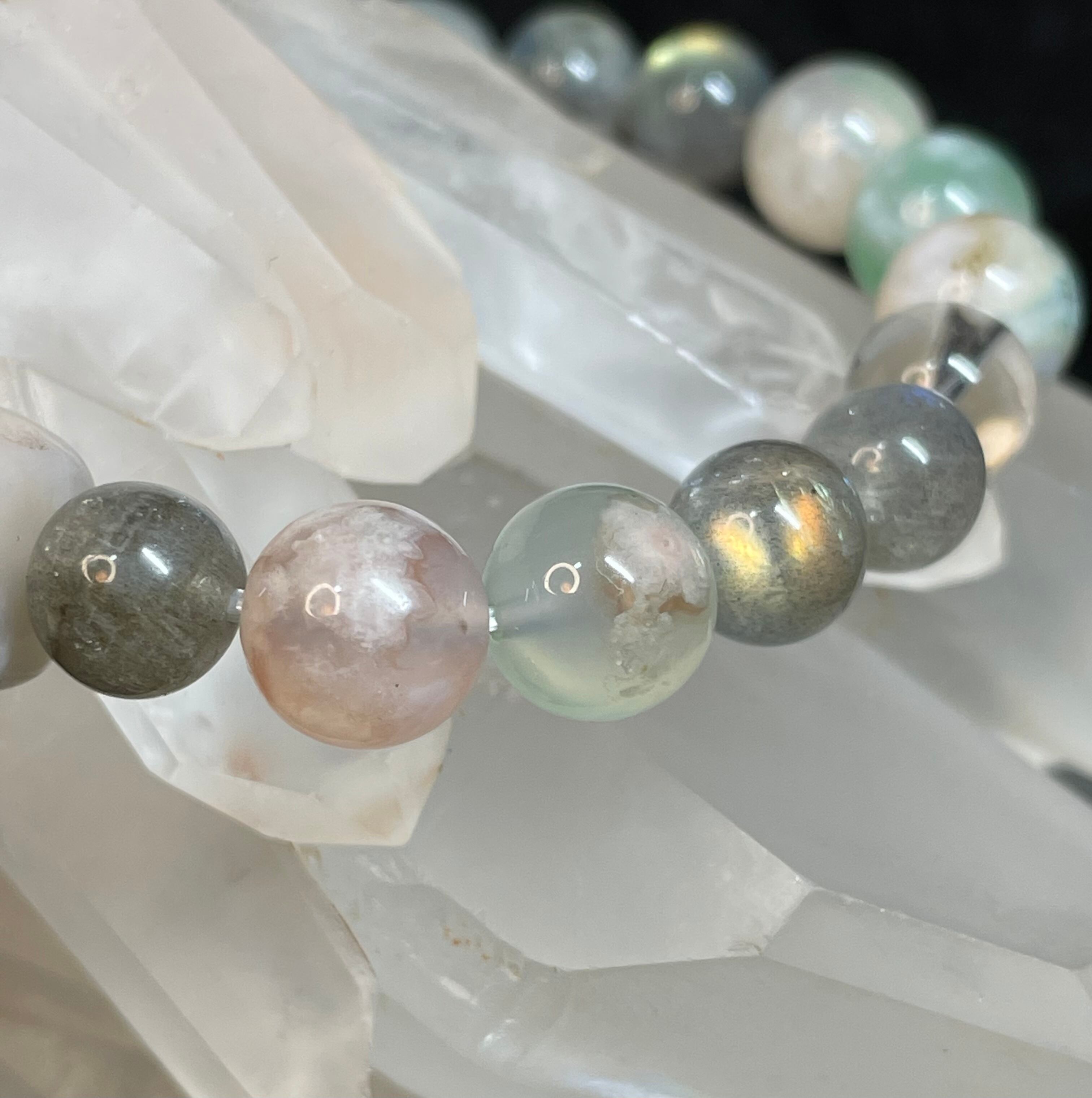 ・石の種類と玉の直径:桜めのう・樽型(約17mm x 12mm)、桜めのう(8mm)、ラブラドライト(8mm)、水晶丸玉(8mm)