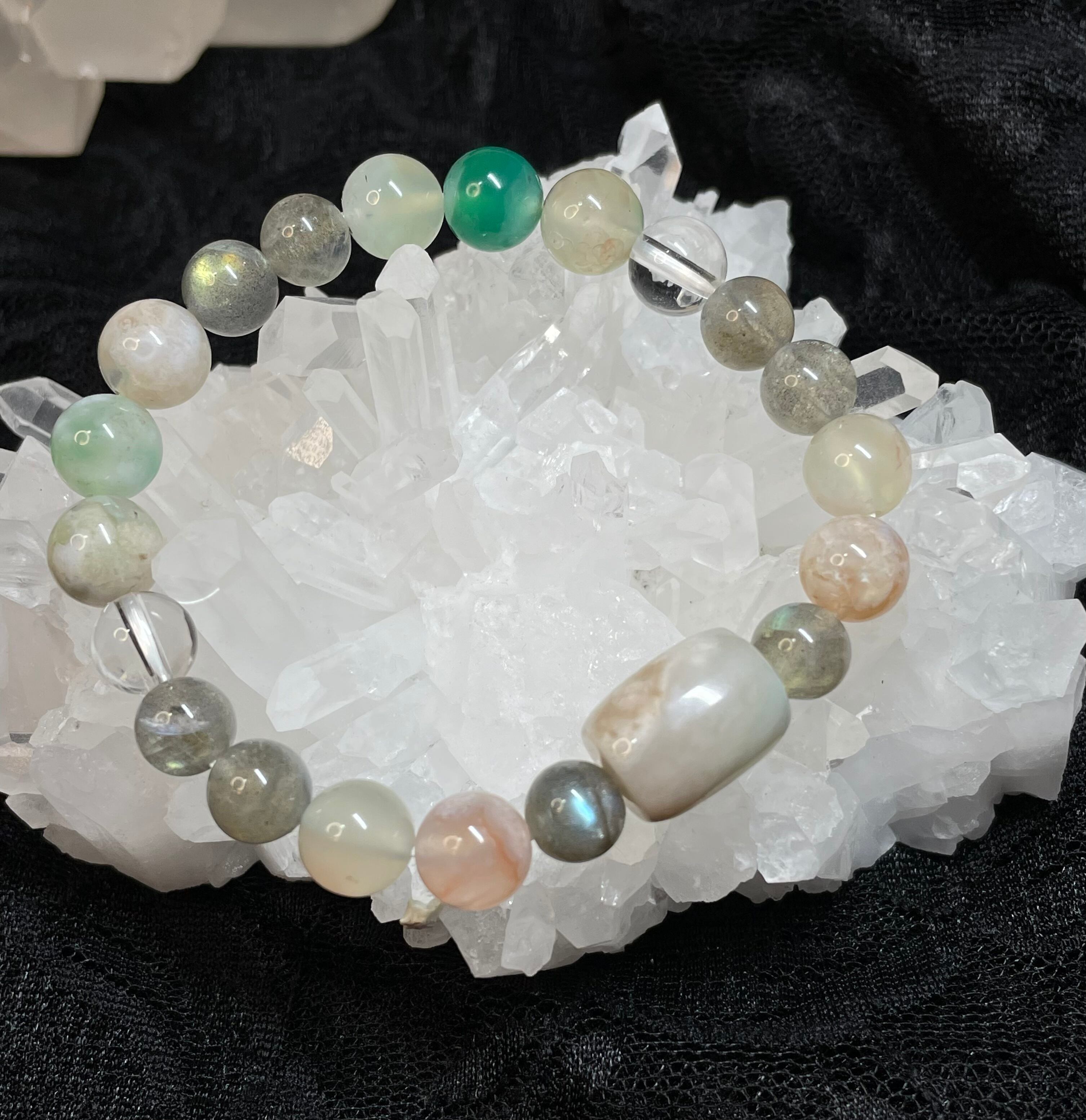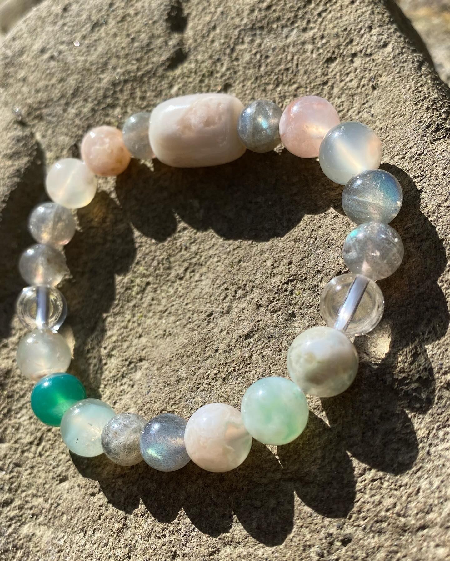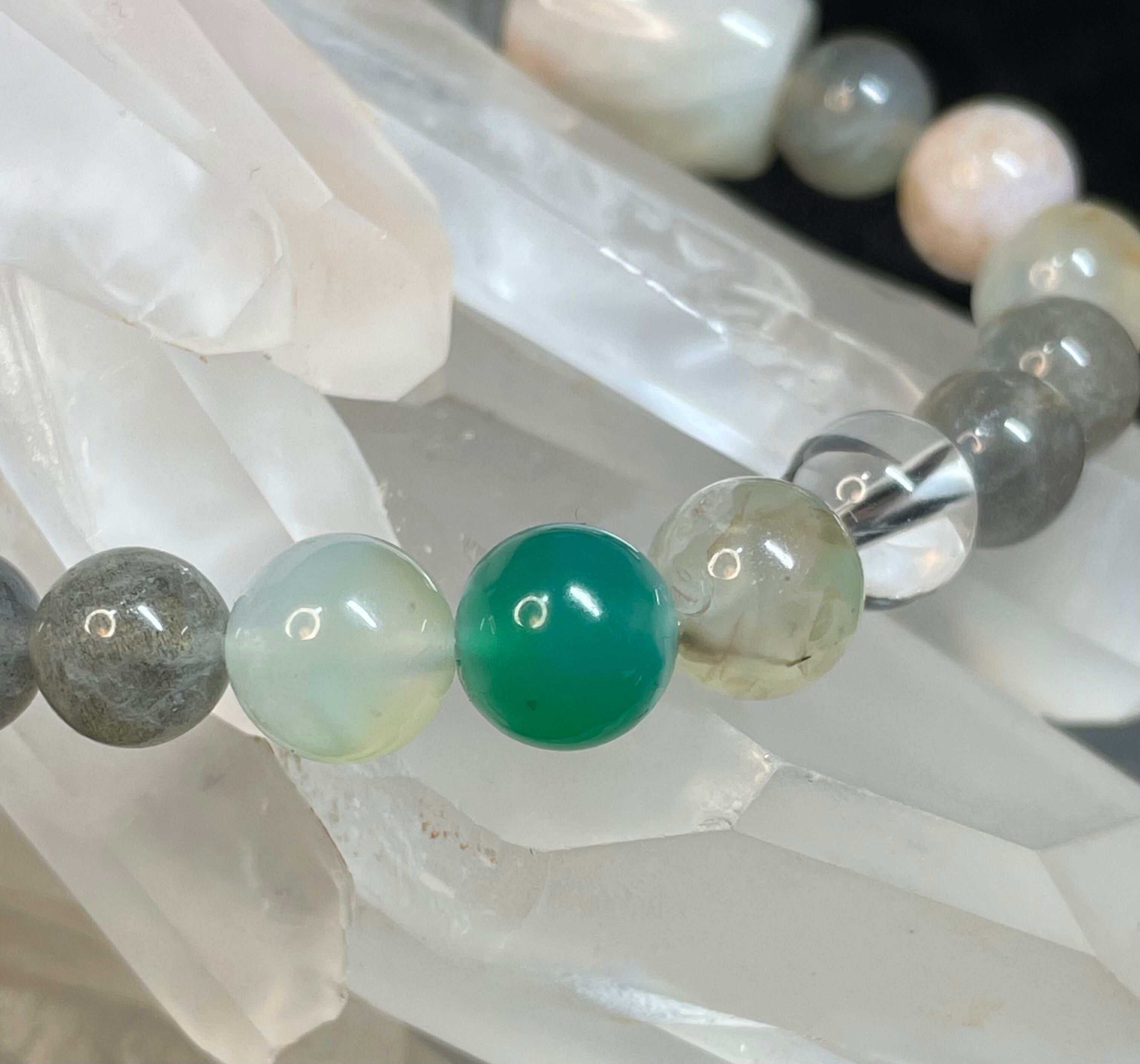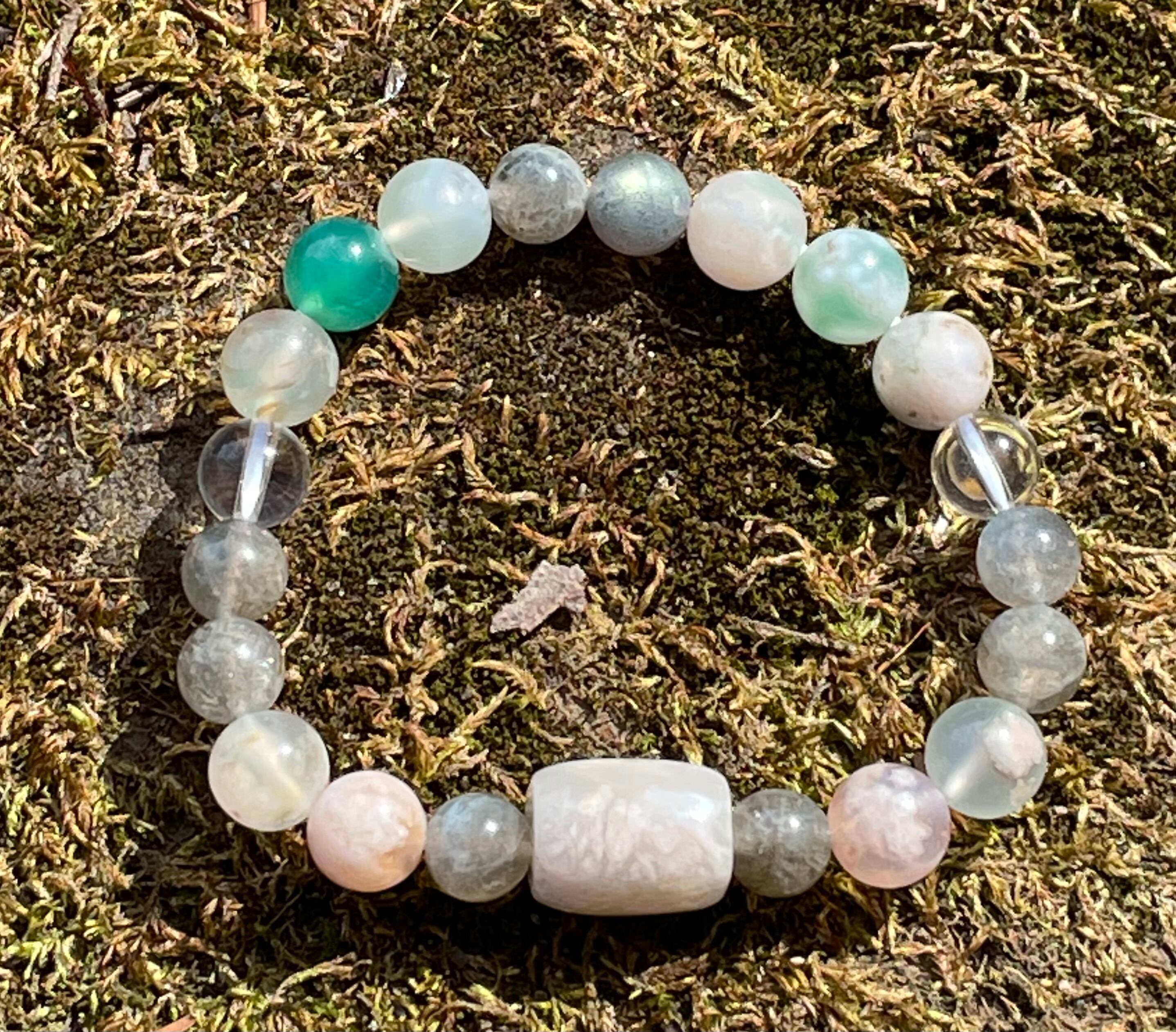 ピンク、緑の桜めのうと、ラブラドライトを組み合わせたブレスです。