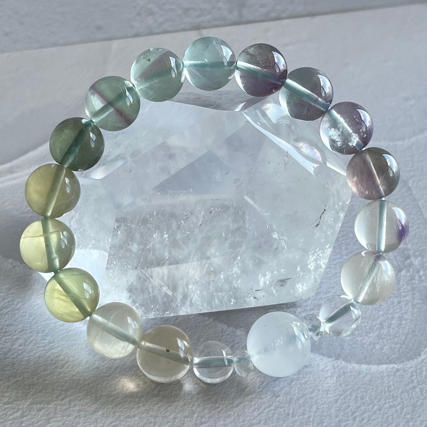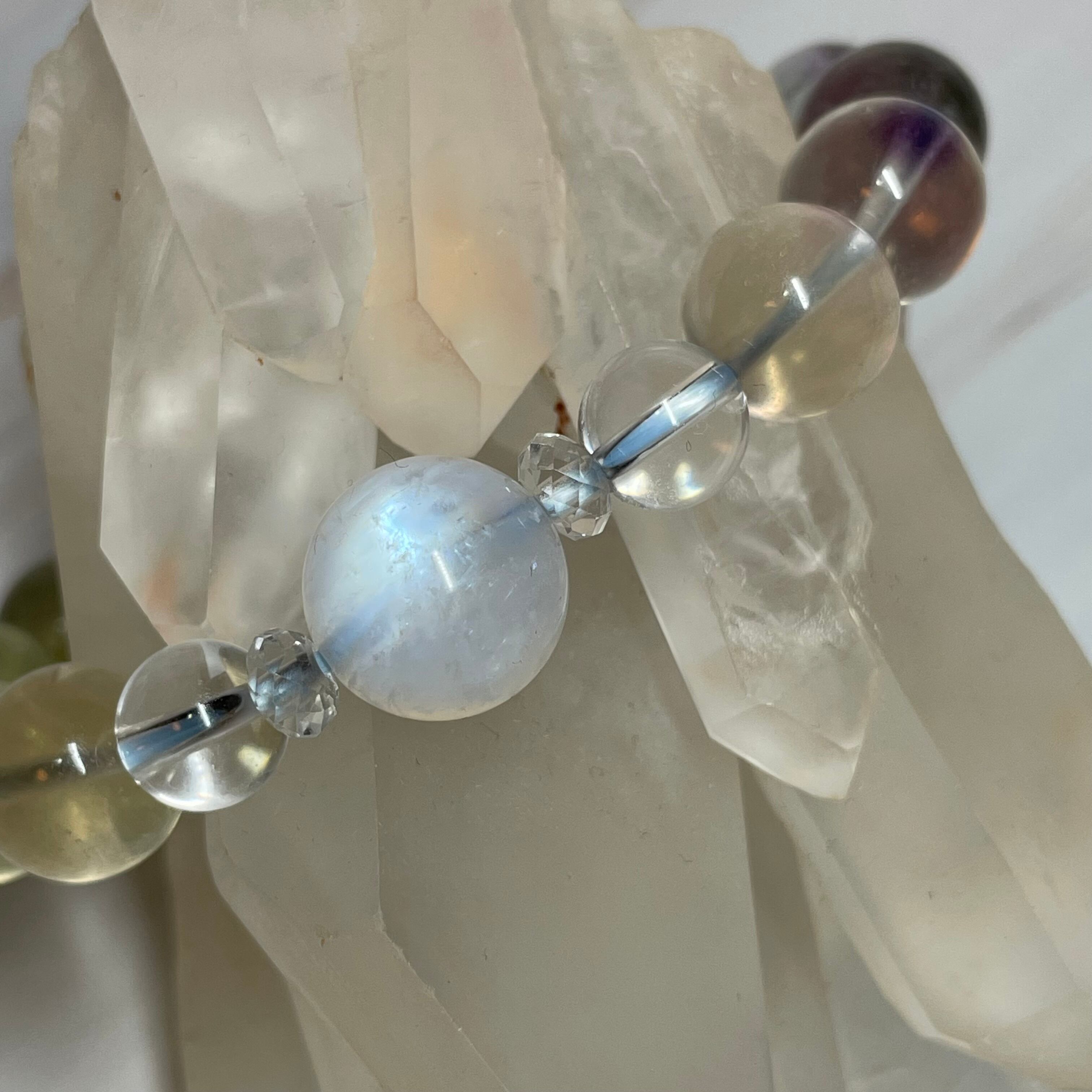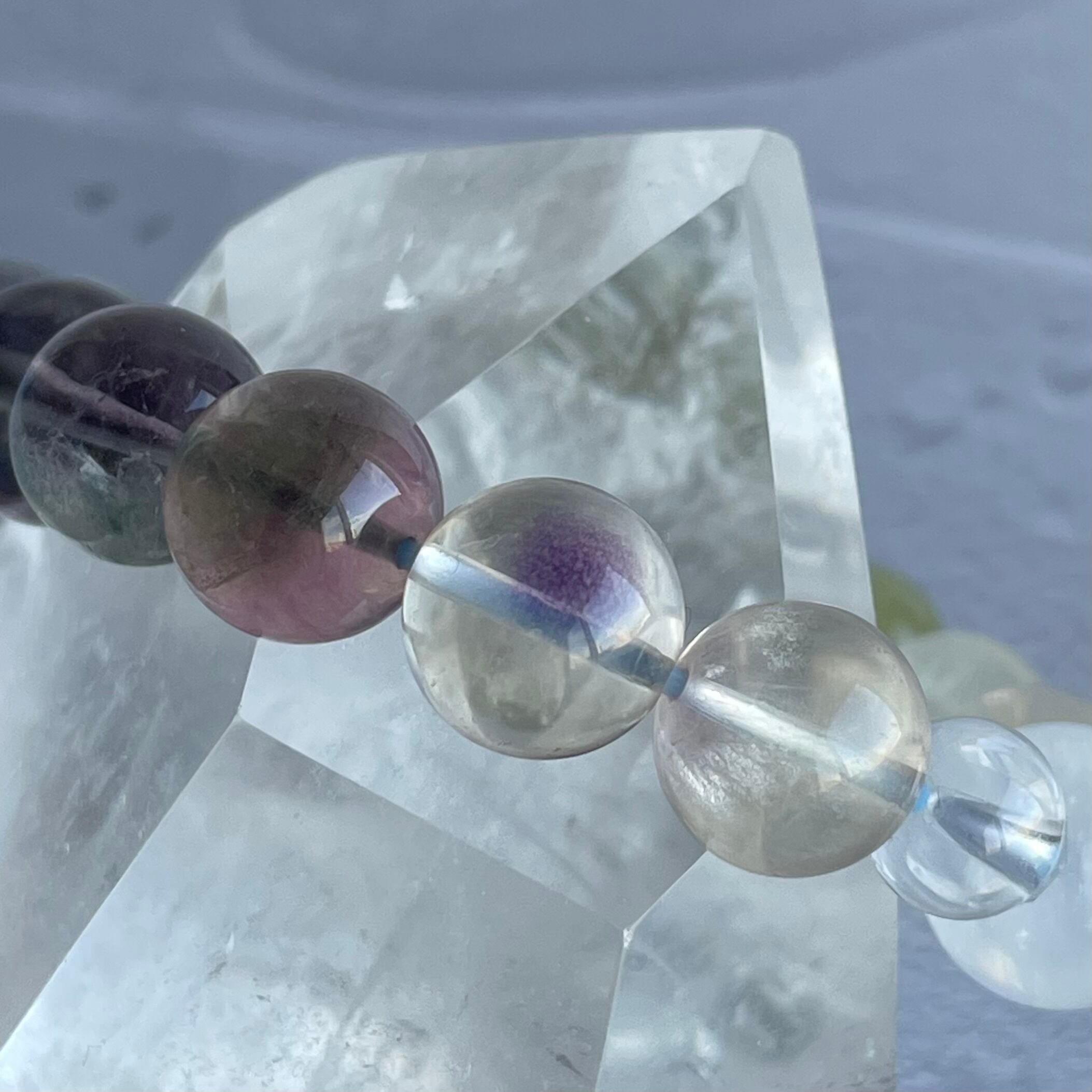淡い色合いのマルチカラーフローライトとブルーのシラーが美しいブルームーンストーンを組み合わせた、シャーベットフローライトブレスです。