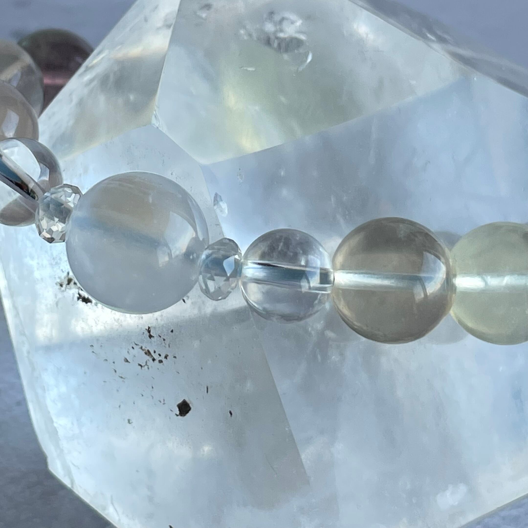 ・石の種類と玉の直径:ブルームーンストーン(13mm)、フローライト(11mm)、水晶丸玉(8mm)、ボタン水晶